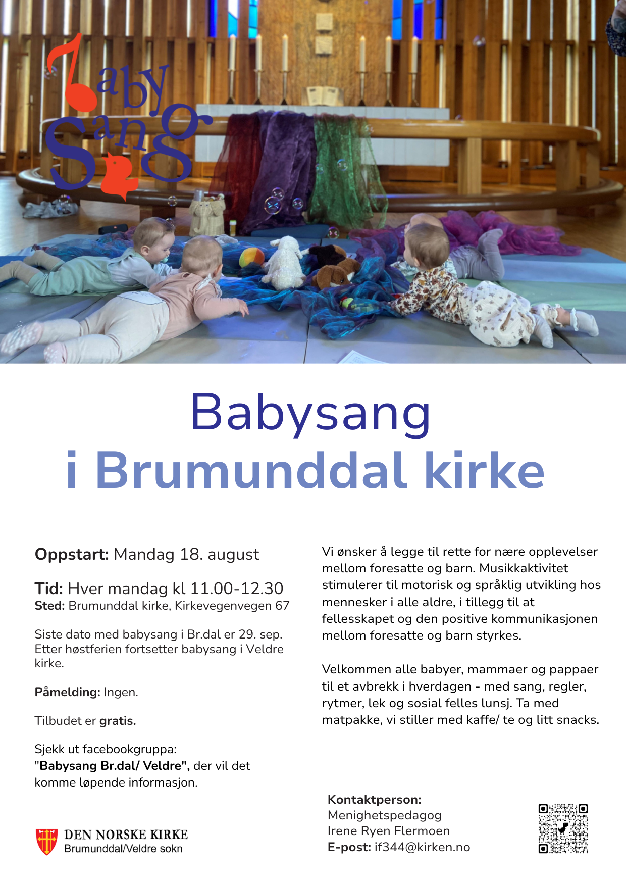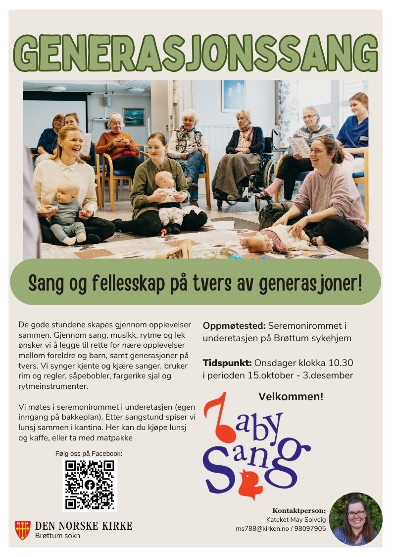 Fra vår store sangskatt henter vi frem både tradisjonelle og nyere sanger. Vi samles på matter og får utdelt sanghefte og rytmeinstrument. Vi synger flere kjente og kjære barnesanger, navnesanger, salmer, rim og regler. Vi bruker mye bevegelser og noe dans. På noen sanger har vi med oss en høyttaler, men stemmen er det viktigste vi har med oss. For å delta kreves det ingen sangkvalifikasjoner eller gode terningkast fra musikkanmeldere. For ditt barn er din stemme den viktigste og vakreste uansett. Babysang passer best for babyer mellom 2 til 12 måneder, sammen med foresatt/mor, far eller annen omsorgsperson. Etter sangstund er det mulig å spise lunsj i kirka, ta med egen matpakke også holder vi drikke og frukt.